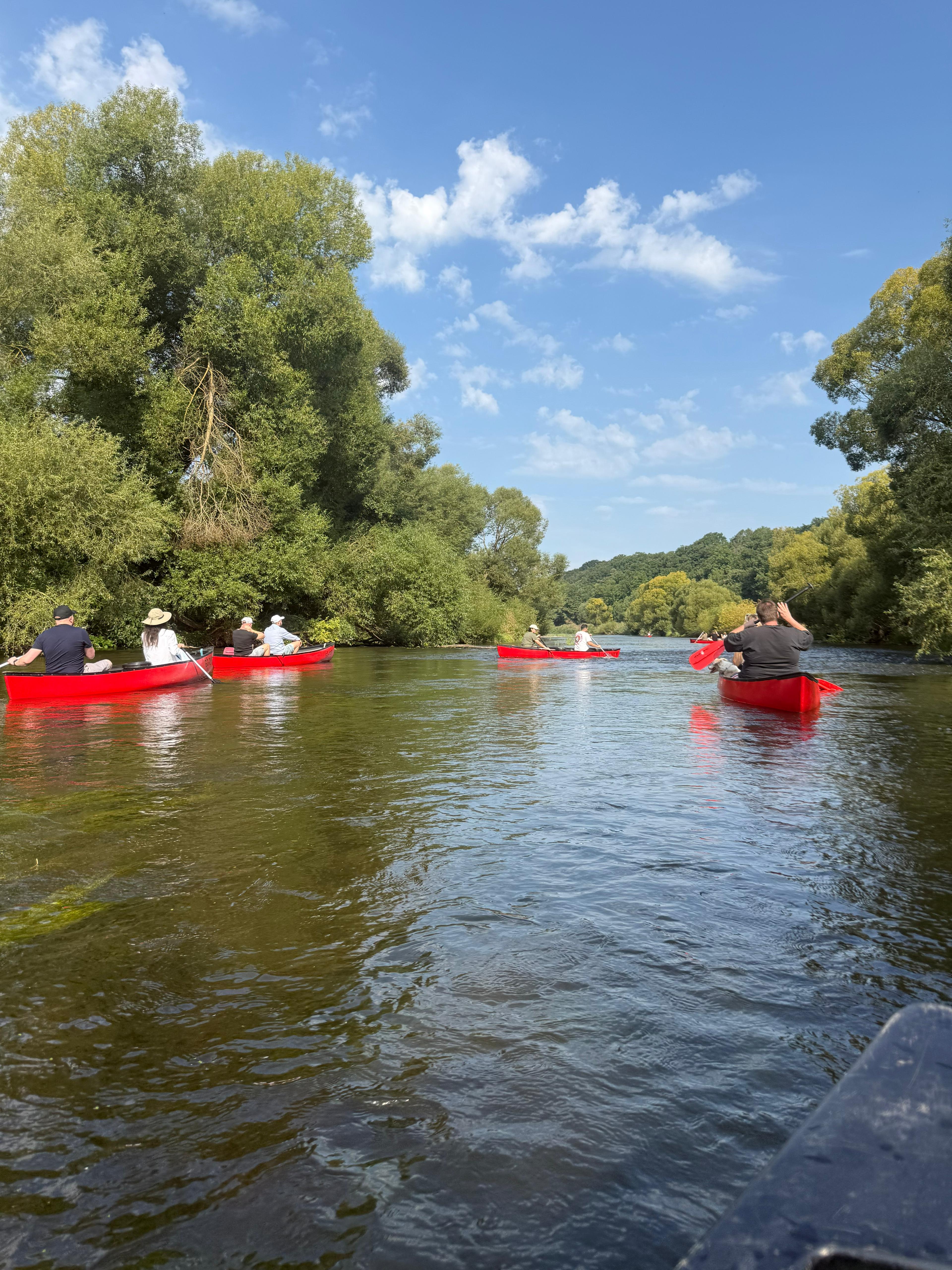 Hauptsächlich Umschüler:innen und einige Dozenten haben sich aufgemacht, um die Fulda mit dem Kanu zu erkunden. Eine willkommene Abwechslung zum Programmieralltag.