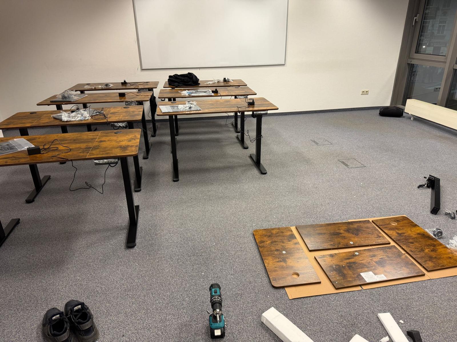 Ein besonderer Meilenstein war die Einrichtung des ersten Unterrichtsraums. Hier können wir bereits einen konkreten Eindruck davon gewinnen, wie der Unterricht in unseren neuen Räumlichkeiten aussehen wird. Mit modernen Arbeitsplätzen und einer durchdachten Raumgestaltung schaffen wir optimale Bedingungen für konzentriertes Lernen und kreatives Arbeiten.
